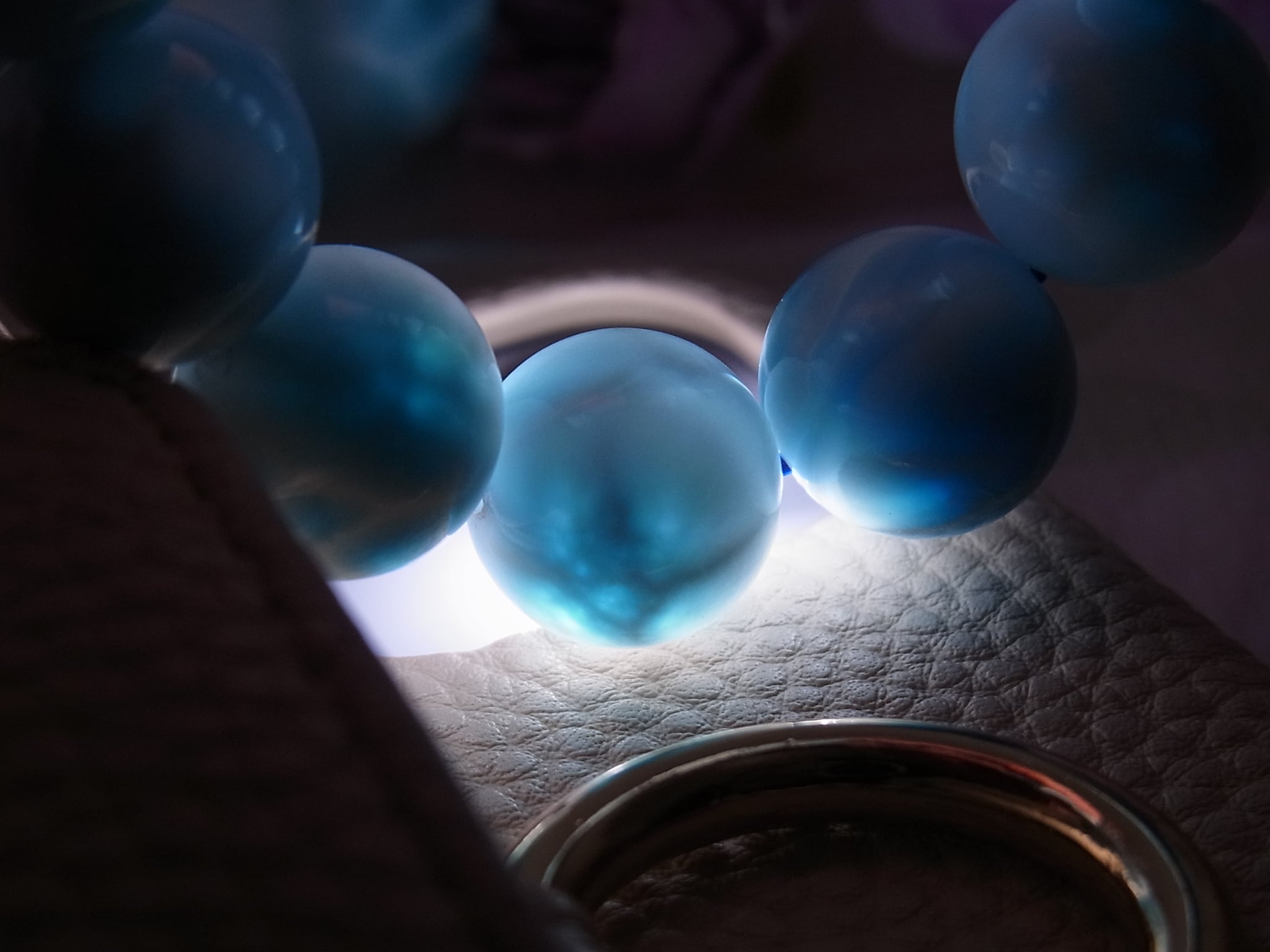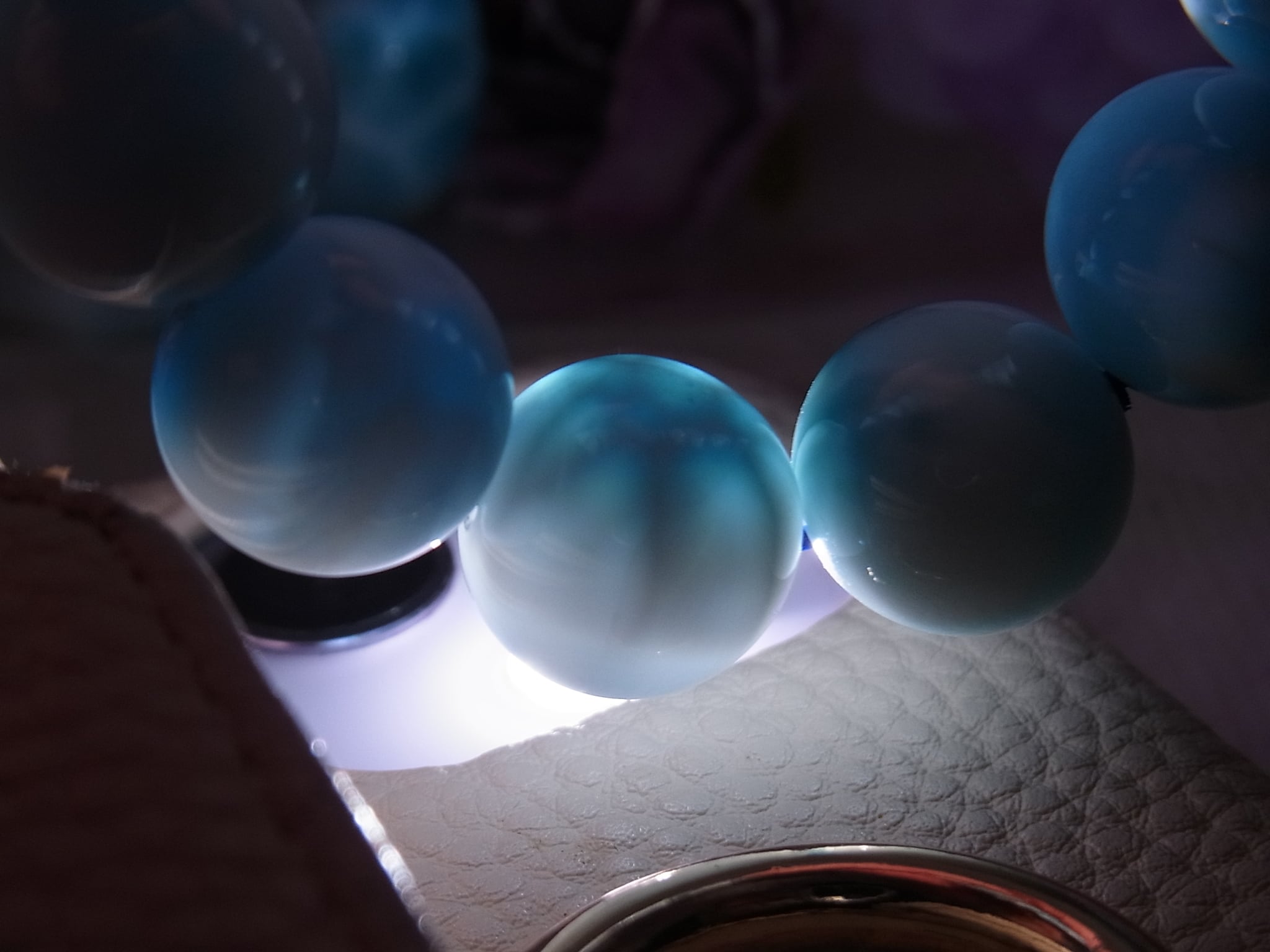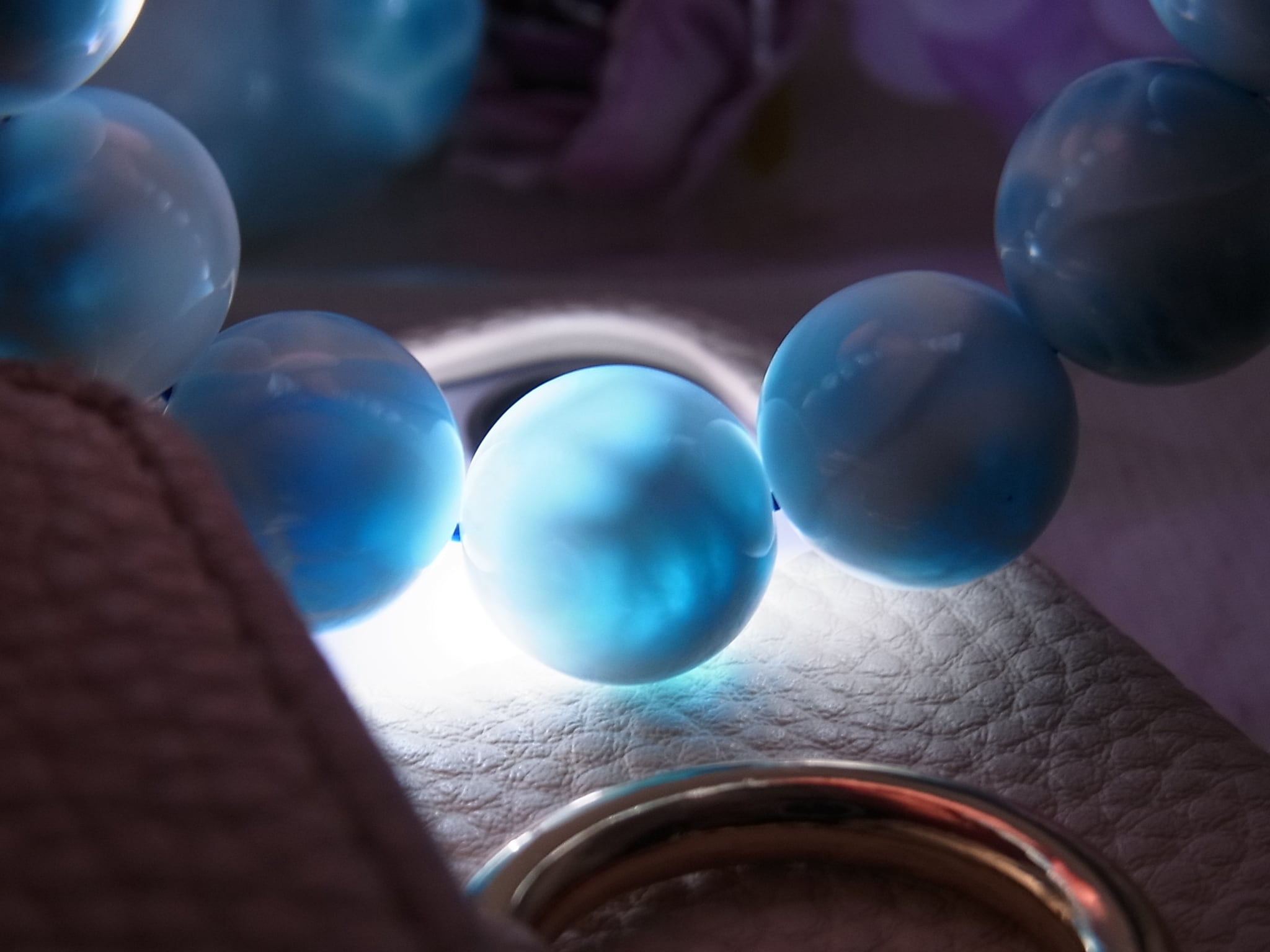 神秘的なブルー、揺らぎの波模様、粒の中の層…