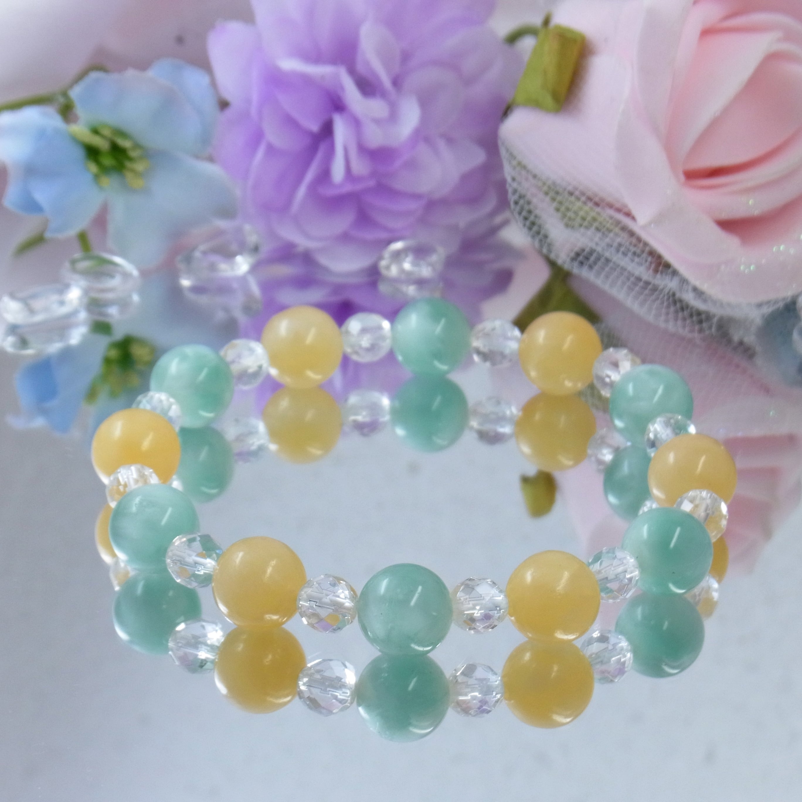 #アラゴナイト #グリーンエンジェライト #水晶 #ミモザ #花 #ヒーリング #癒し #love #beauty #美しい #愛 #大人可愛い #美しい #マスカット #お守り #天然石ブレスレット #お洒落 #プレゼント #母の日 #クリスタル #ゴムブレス #ねこの夢 #LarimarMJ