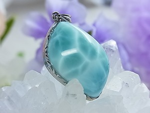 ぽってりとした厚みがあり、波の雫のような アンニュイな形の ラリマーペンダントです。