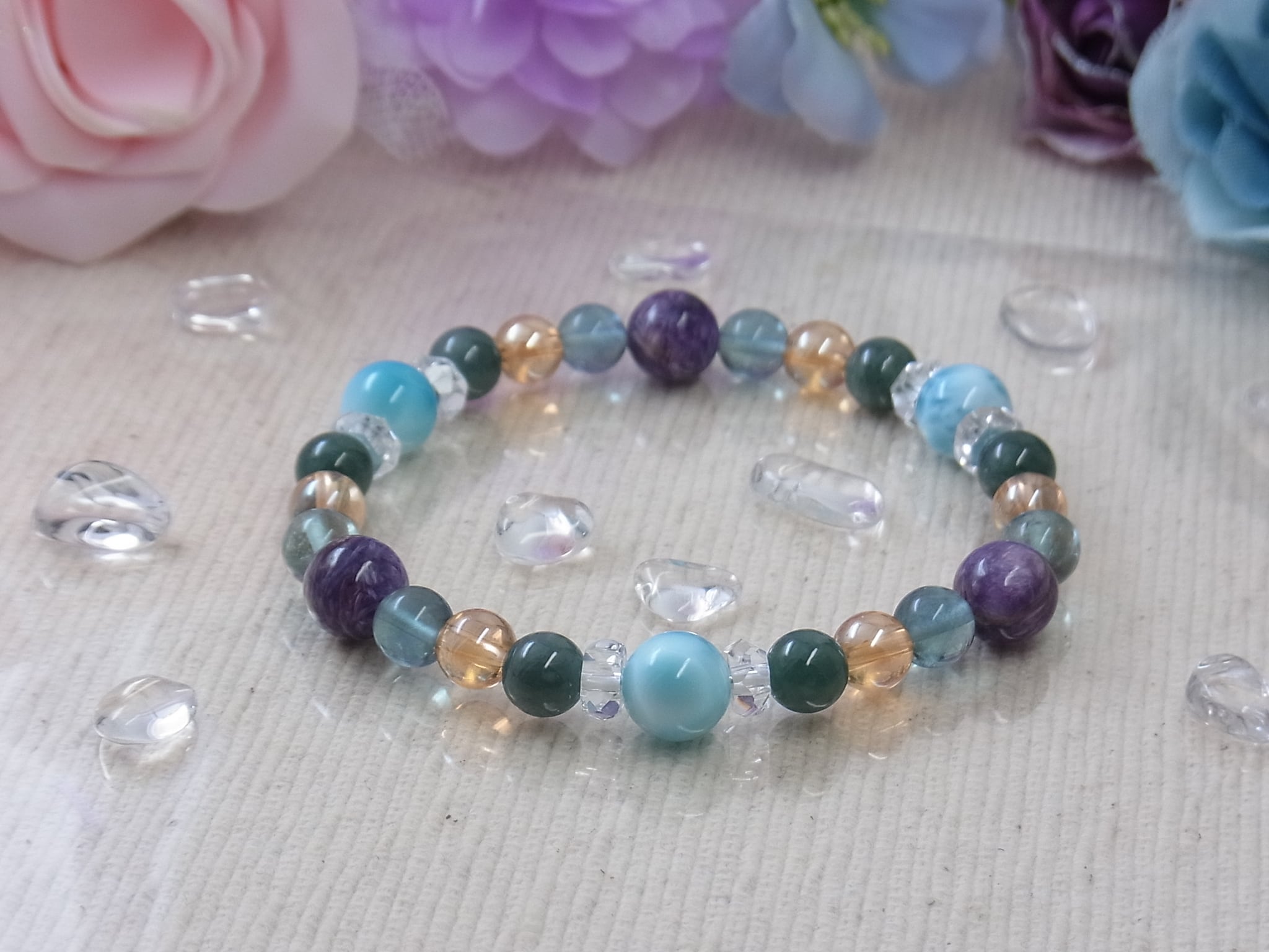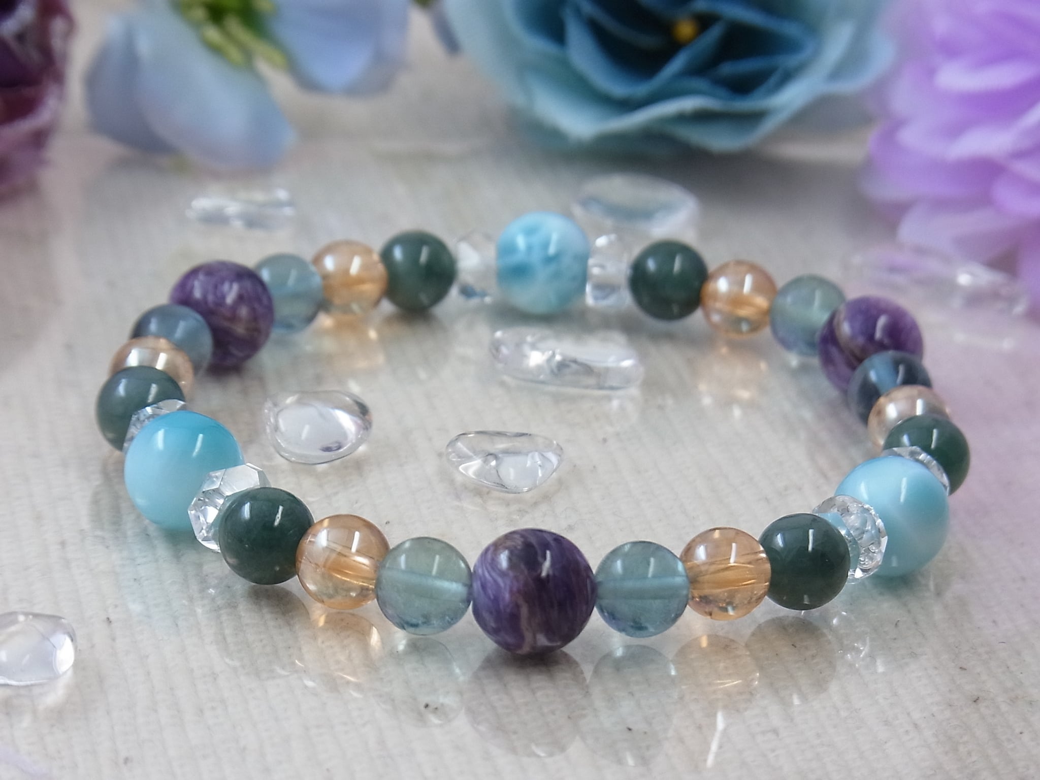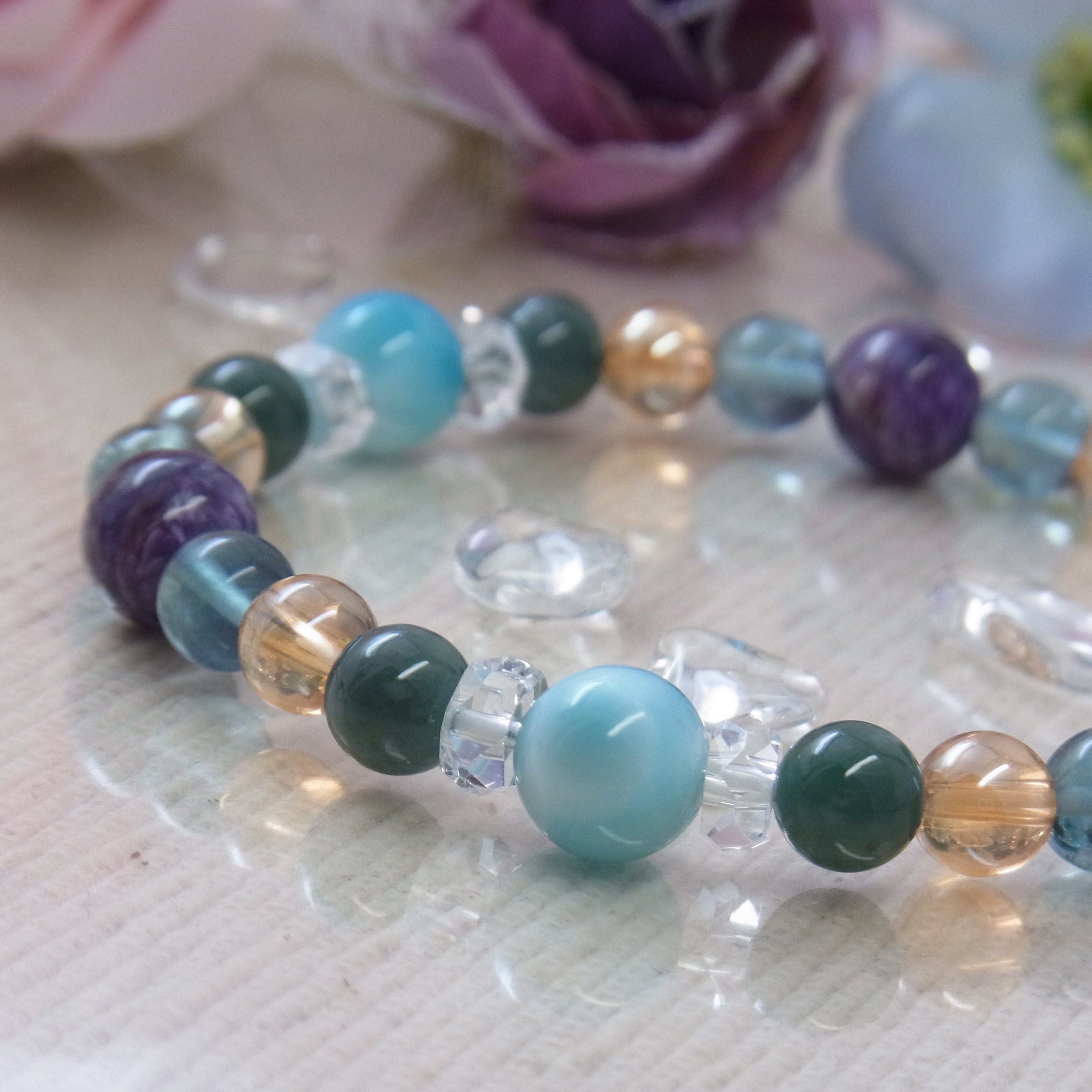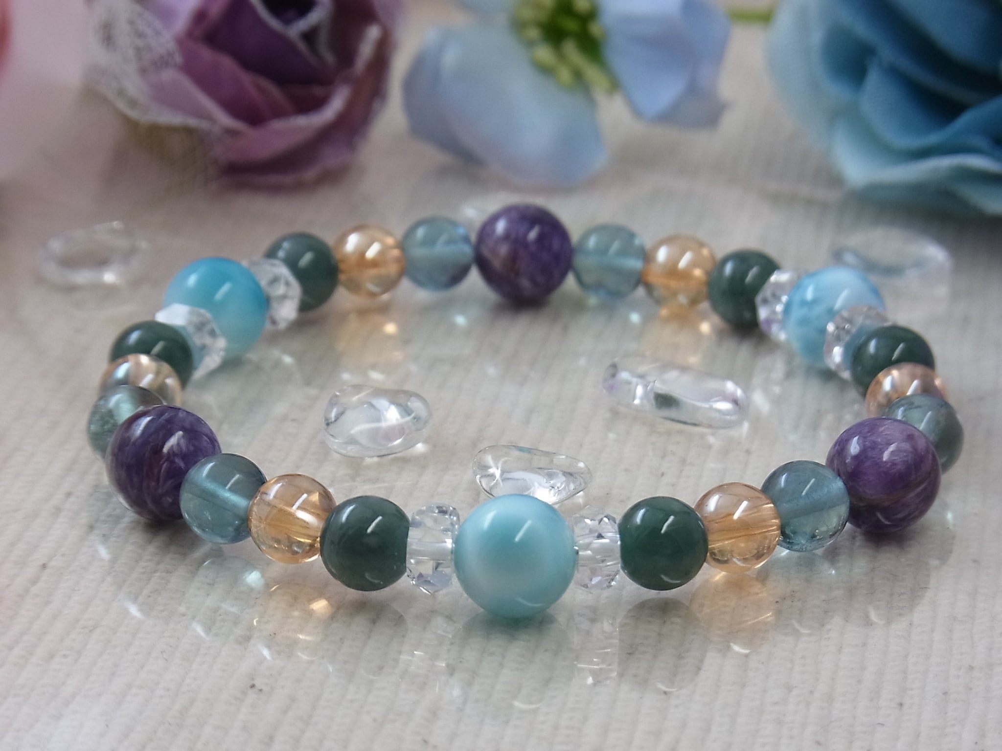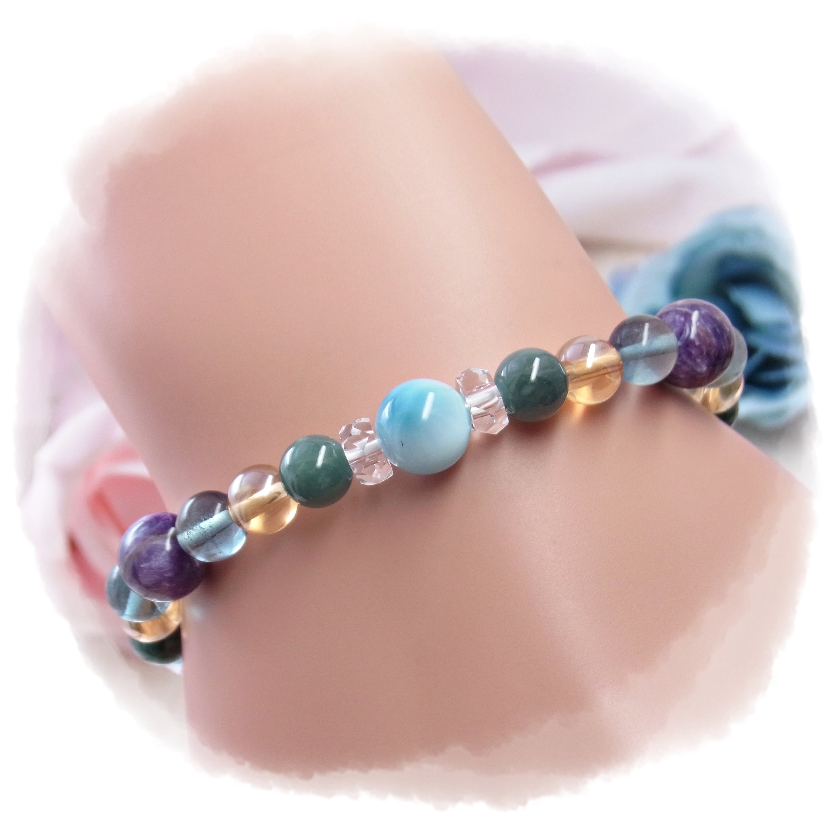 世界三大ヒーリングストーン…ラリマーとチャロアイトを含む、大人シックなブレスレットです。