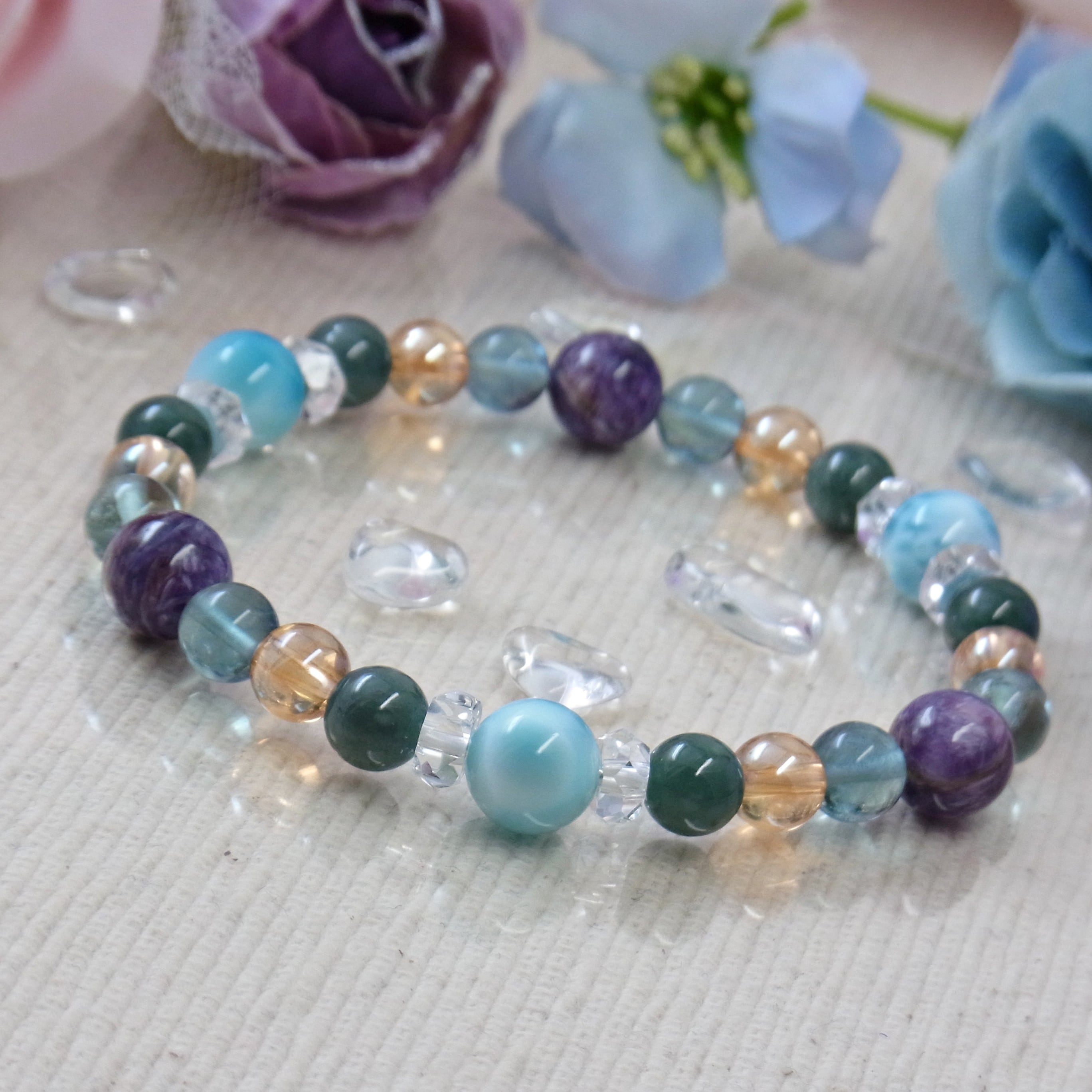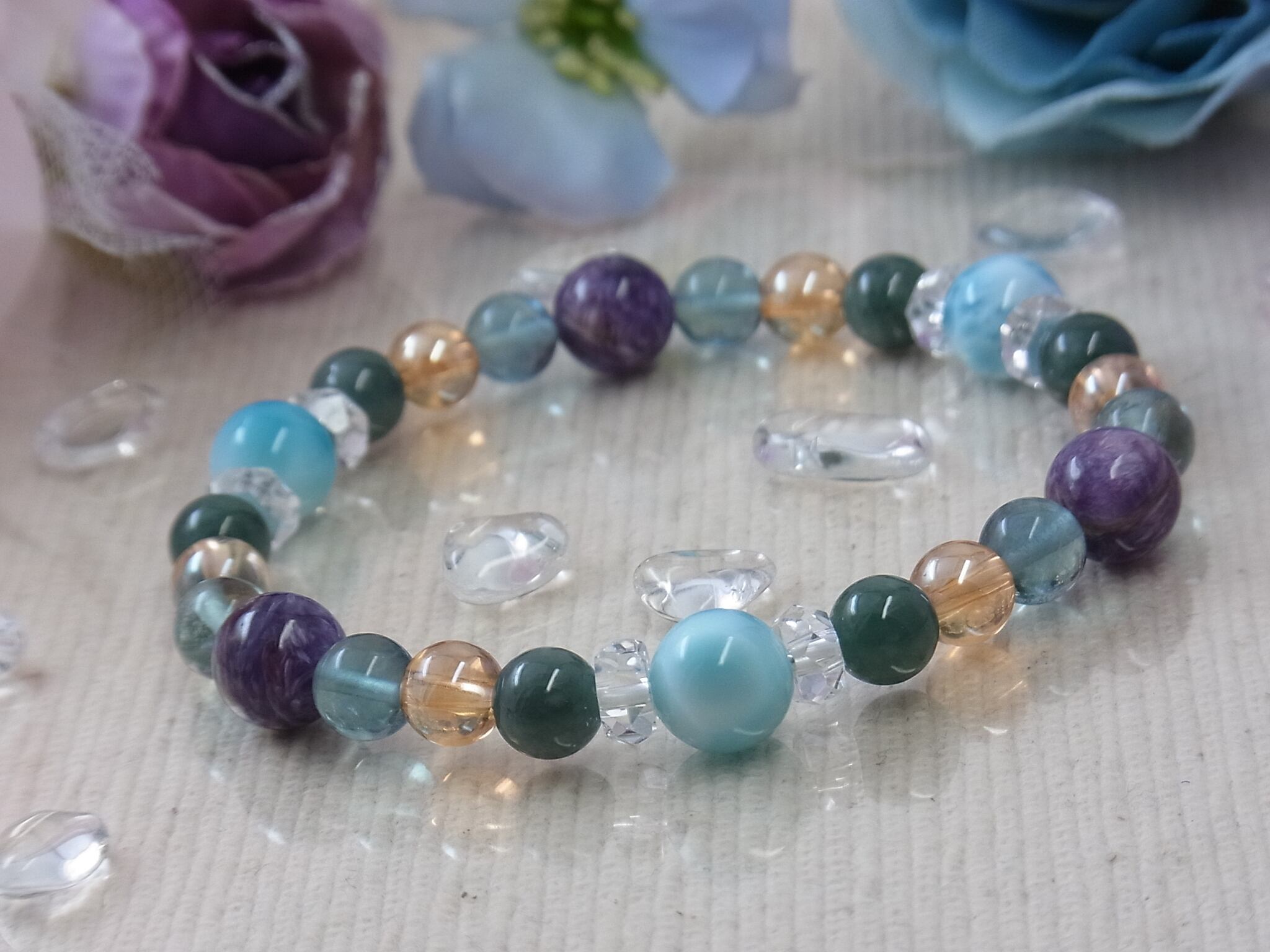 #ラリマー #チャロアイト #翡翠 #フローライト #ゴールデンオーラ #世界三大ヒーリングストーン #ブルー #パープル #紫 #シック #大人 #お洒落 #ブルー #美しい #春 #夏 #秋 #冬 #スキンジュエリー #シンプル #毎日つけたい #肌なじみ #大人可愛い #高級感 #プレゼント #オールシーズン #ゴムブレス #LarimarMJ