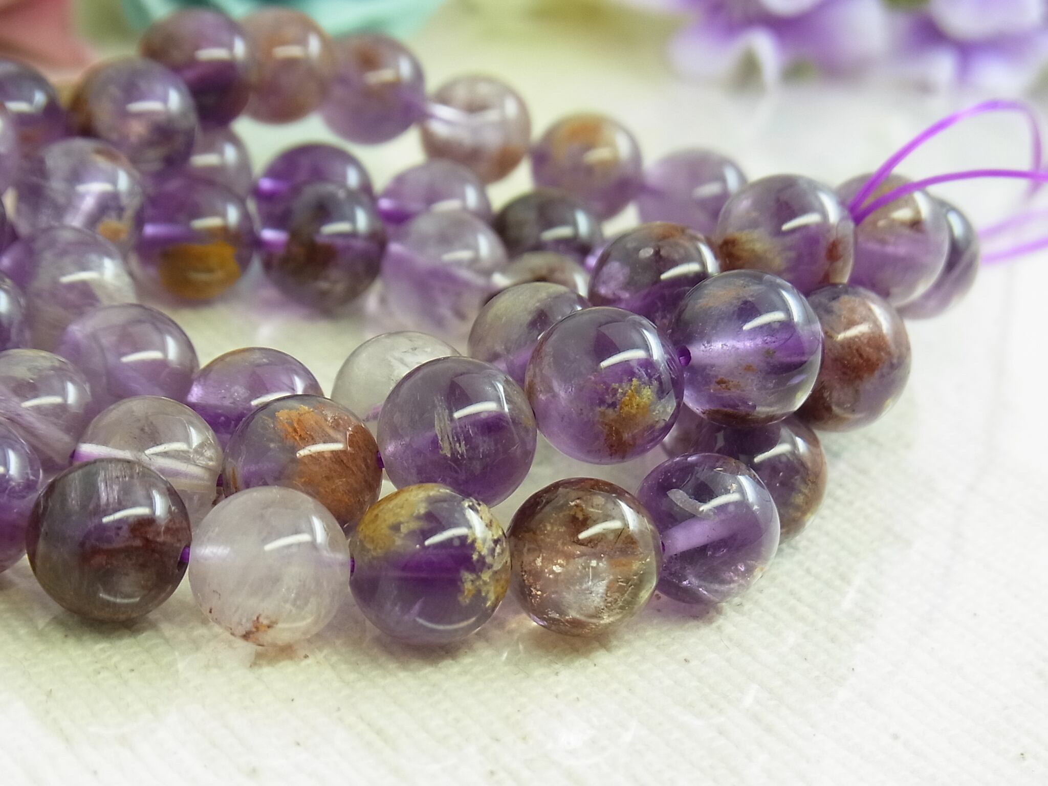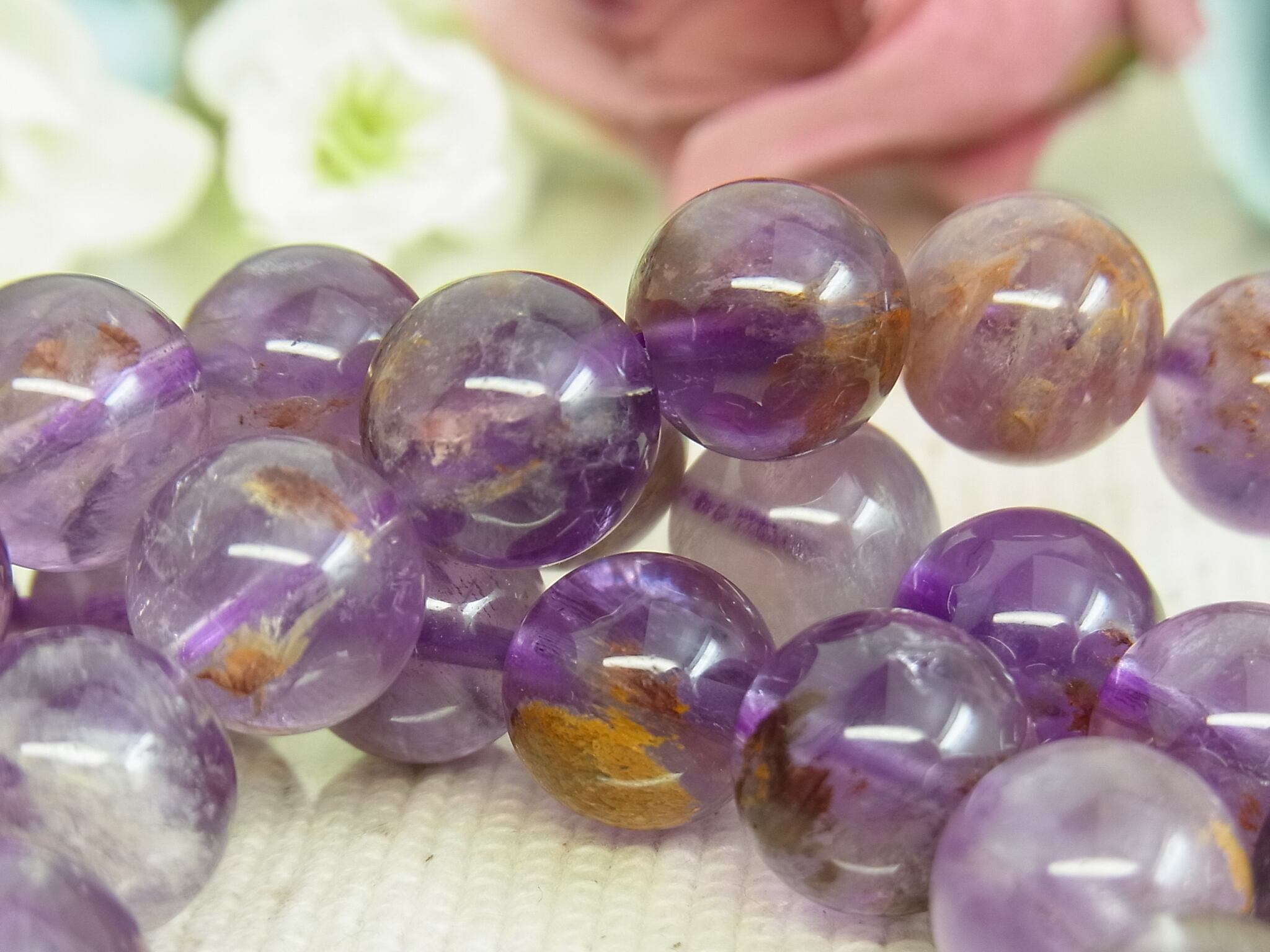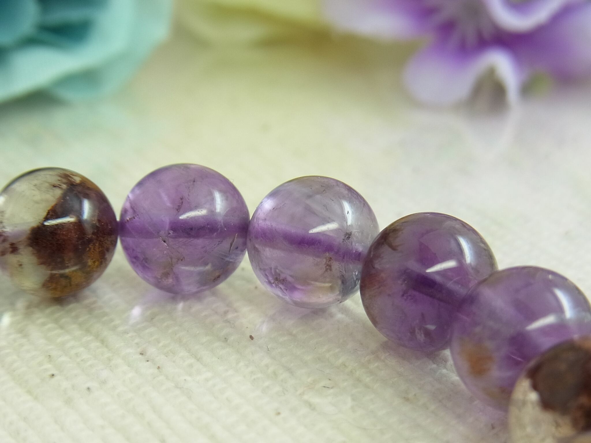 透明感のあるアメジストの中に、雲母(うんも/マイカ)やクローライト(緑泥石)、ヘマタイトなどが内包された珍しい天然石です。