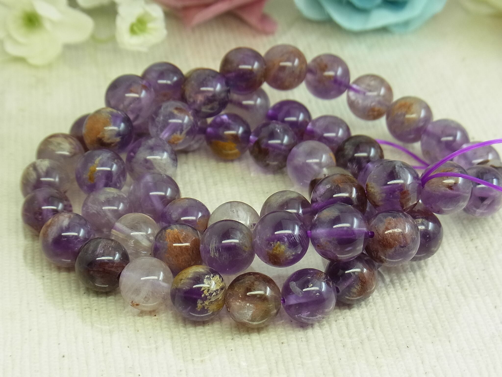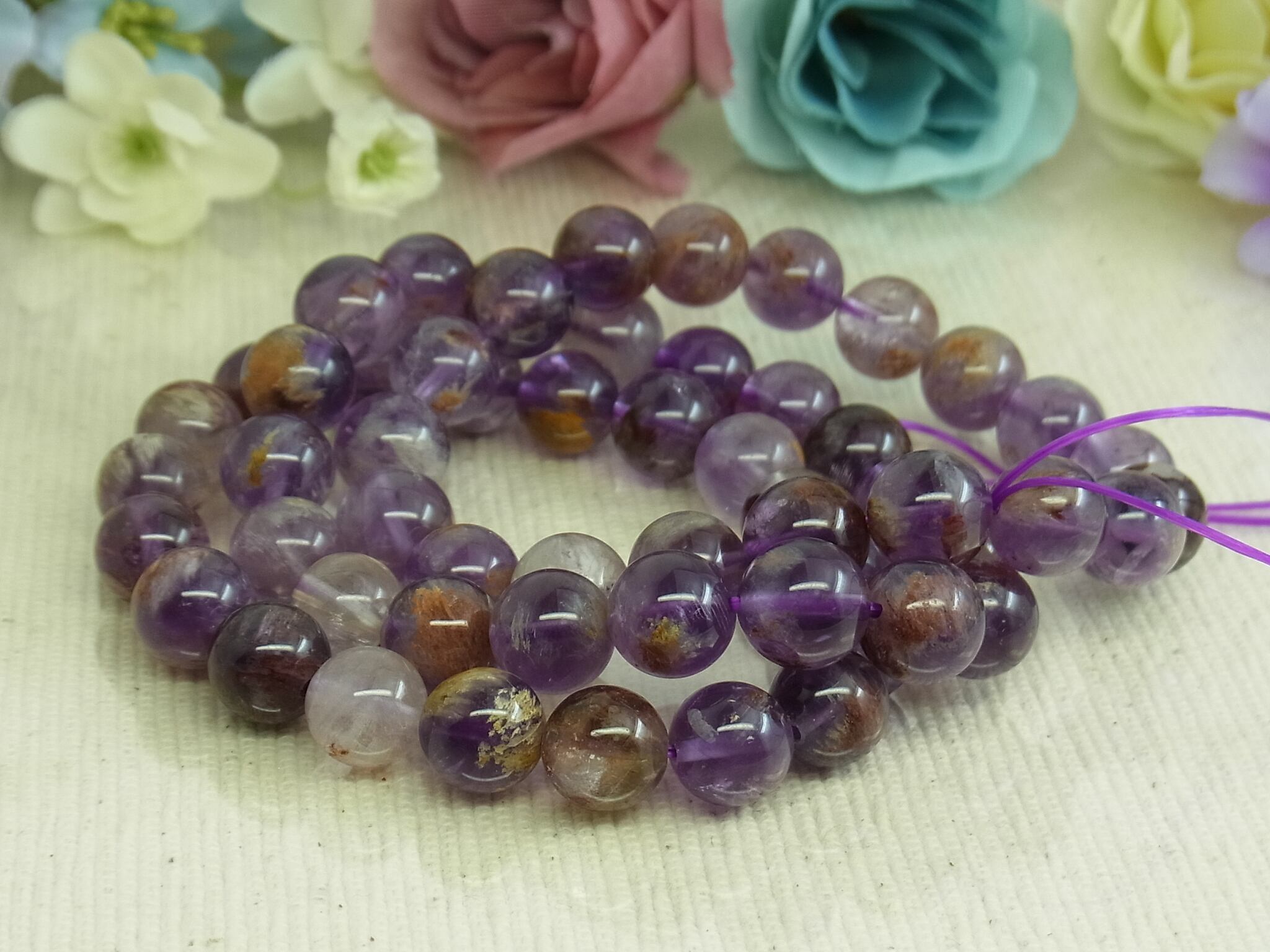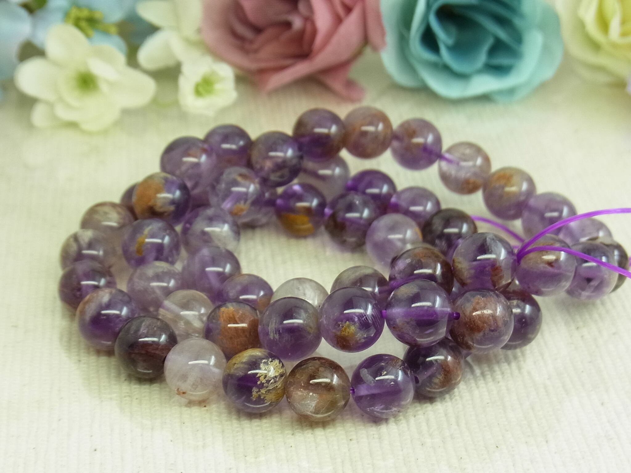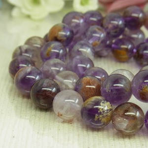 透明感のあるアメジストの中に、雲母(うんも/マイカ)やクローライト(緑泥石)、ヘマタイトなどが内包された珍しい天然石です。