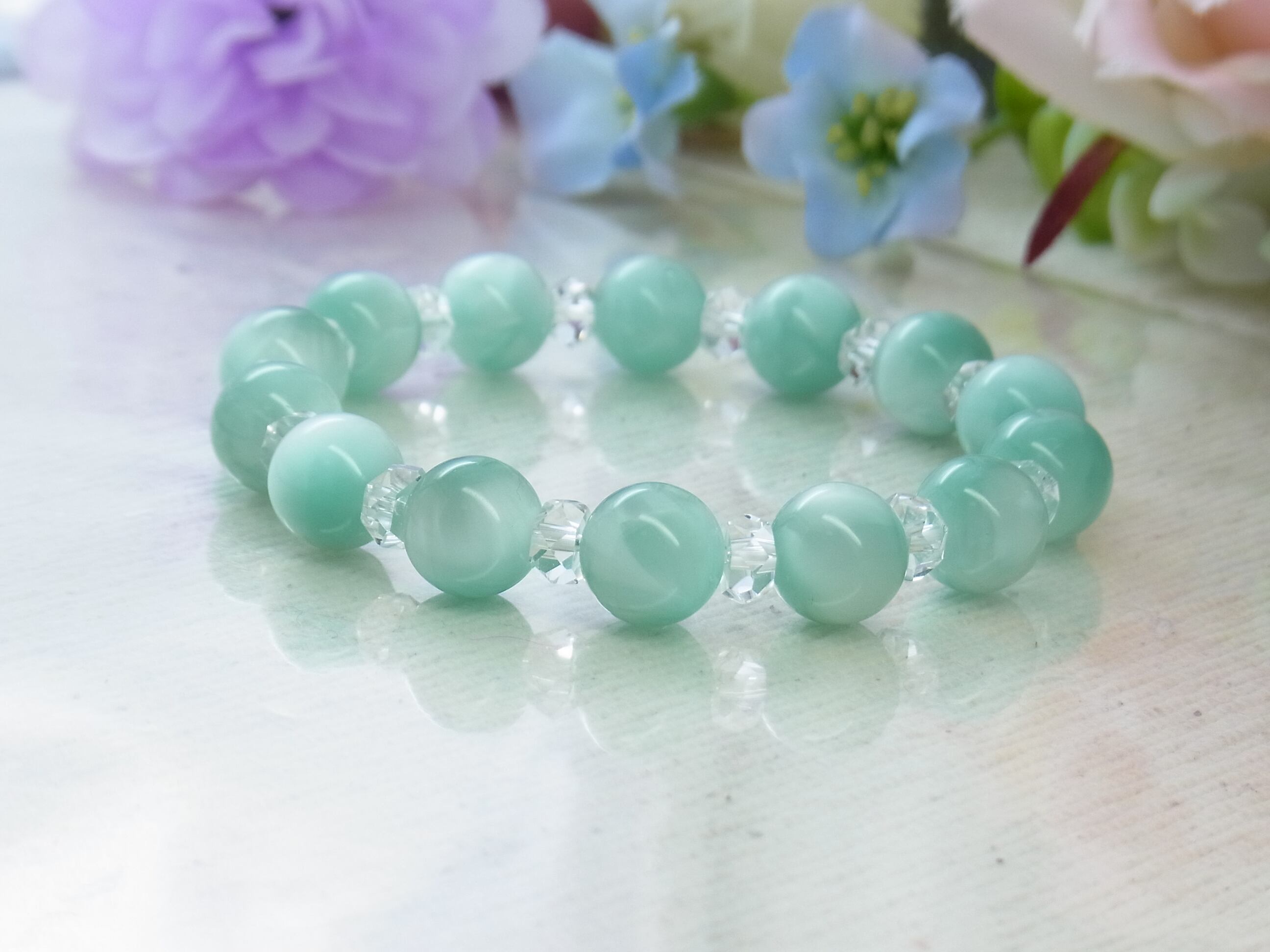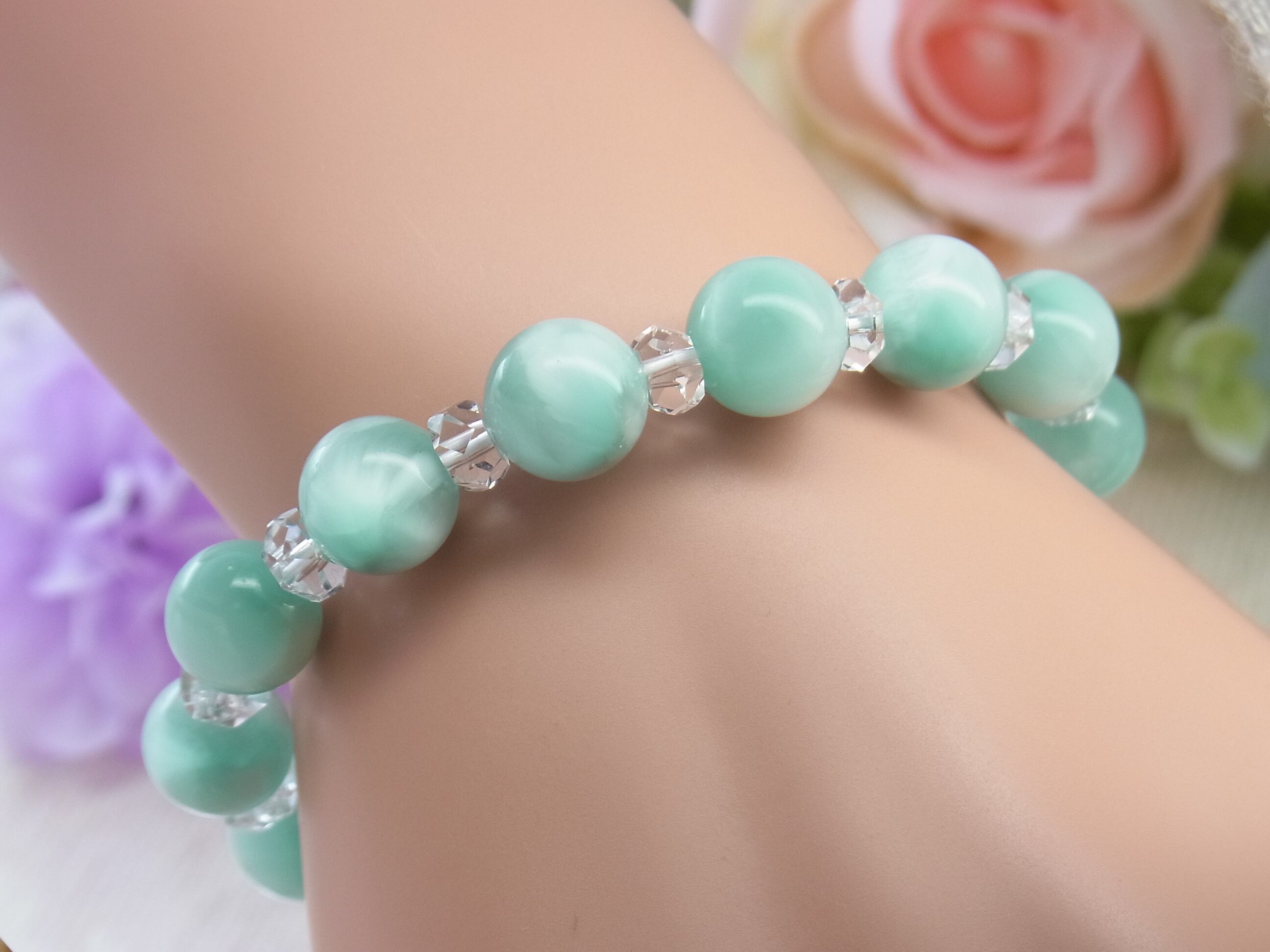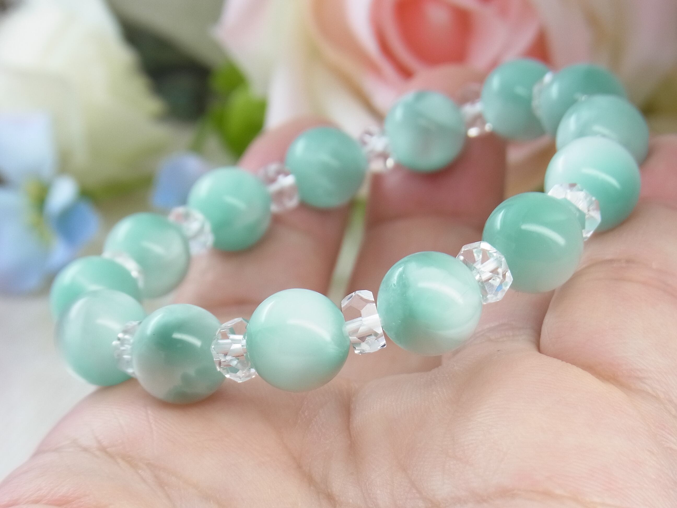 #グリーンエンジェライト #クリスタル #天使 #accessory #ブレスレット #ペパーミントグリーン #ホワイト #コントラスト #森林浴 #癒しアイテム #セレブ #お洒落 #シンプル #緑 #グリーン #マーブル #春夏 #春のお洒落 #上品 #プレゼント #LarimarMJ #ねこの夢