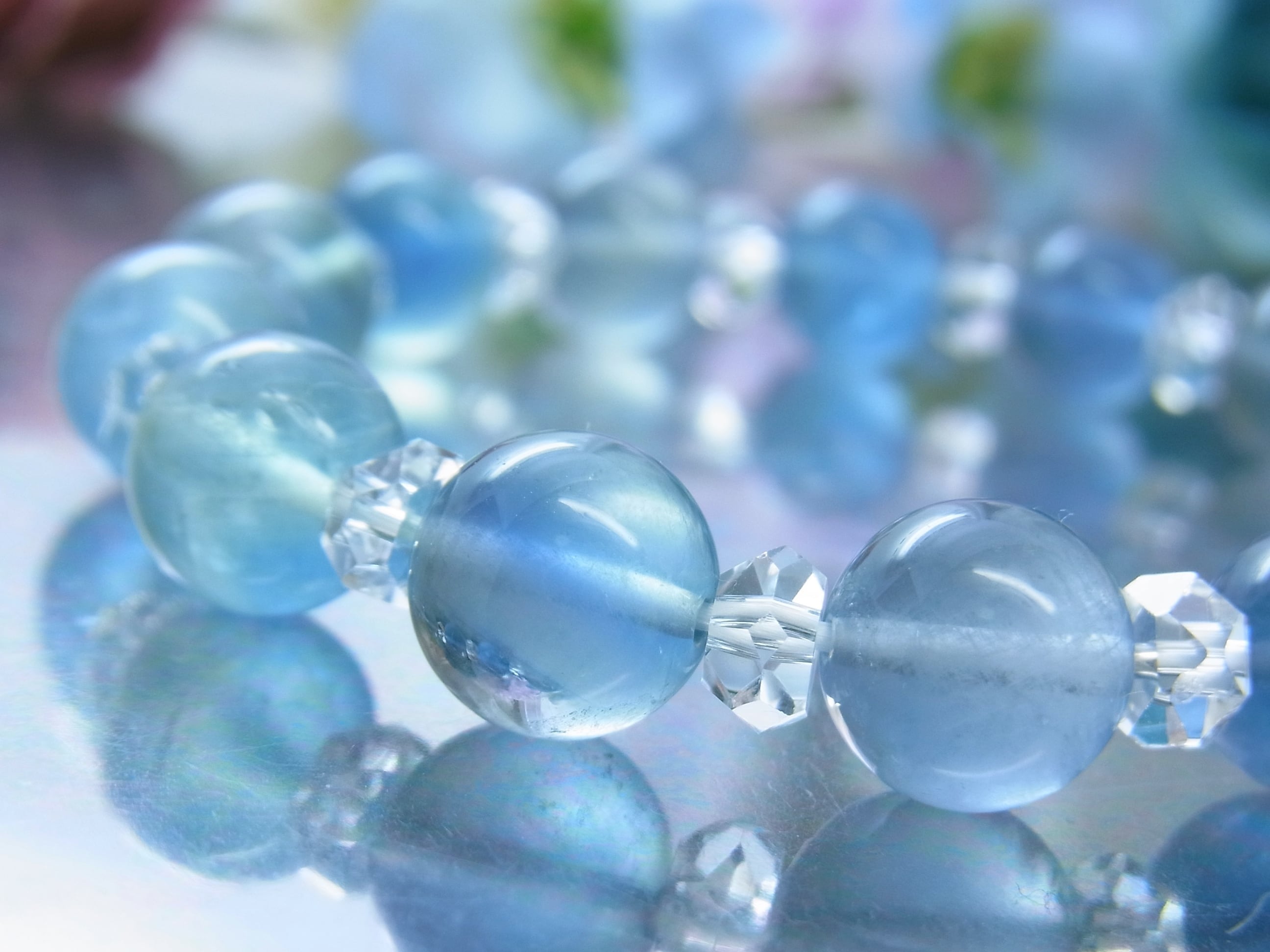 ブルーの濃淡が特徴的で、ストーンによってはツーカラーの粒も混ざります。